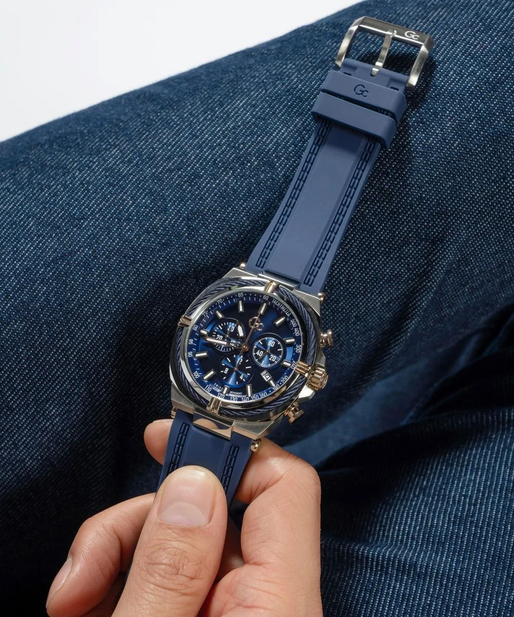 With its unique cable-wire on top ring - the Gc IronClass and its 43mm cushion case and chronograph movement shows a mix of coolness and sophistication. This version with a silver tone case is elevated with details in blue and rose gold PVD, featuring a blue dial with a smooth silicone strap.